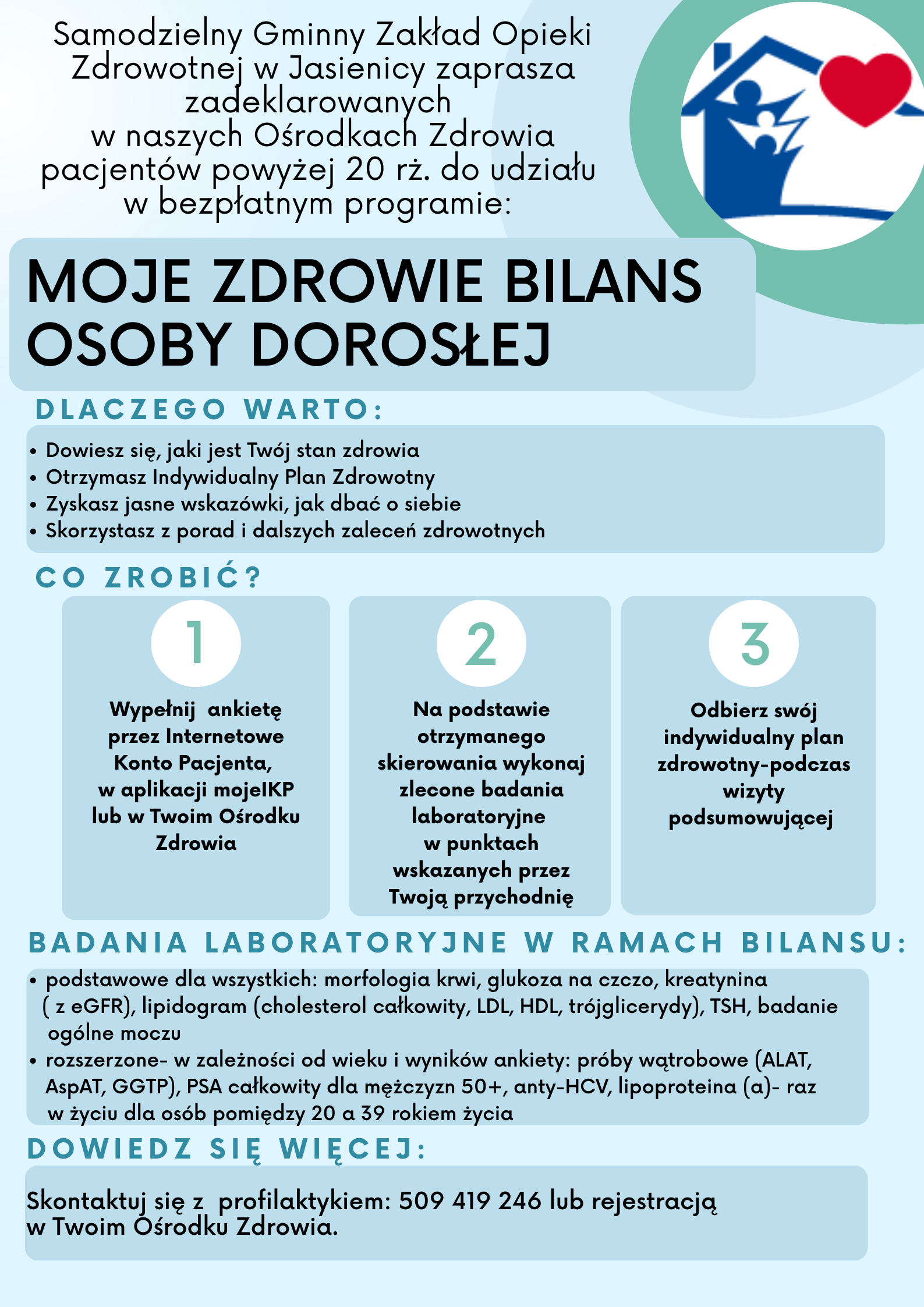 Samodzielny Gminny Zakład Opieki Zdrowotnej w Jasienicy zaprasza zadeklarowanych w naszych Ośrodkach Zdrowia pacjentów powyzej 20 rż. do udziału w bezpłatnym programie:
